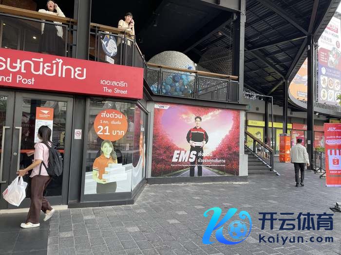 泰国曼谷的The Street Ratchada Mall,电商降临,蚁合了许多大公司和华东说念主社区。这里50米内密布着5家快递物流公司,包括EMS、泰国当地的快递品牌Flash Express、顺丰旗下的嘉里物流以及印尼起家的极兔,致使电商平台Shopee旗下的自营快递公司也有一间门店。