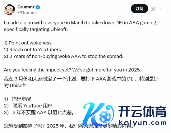 @Grummz修起说念,我方早在本年3月便与赞成者们制定了一个针对3A游戏公司DEI(多元、平允、包容)文化的筹谋,相等所以育碧(Ubisoft)为盘算。他列出了三大步履: